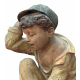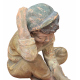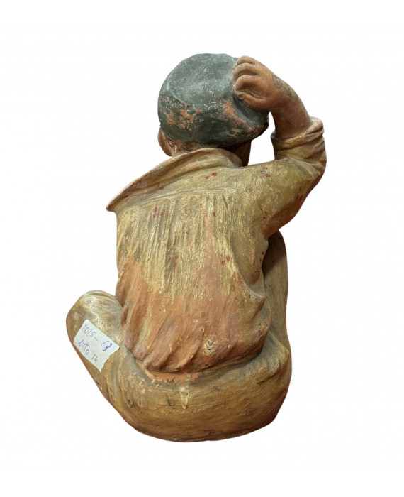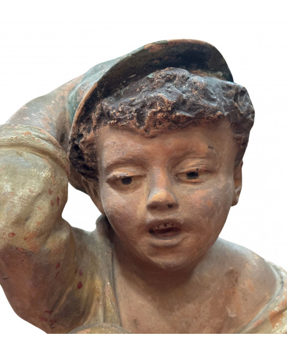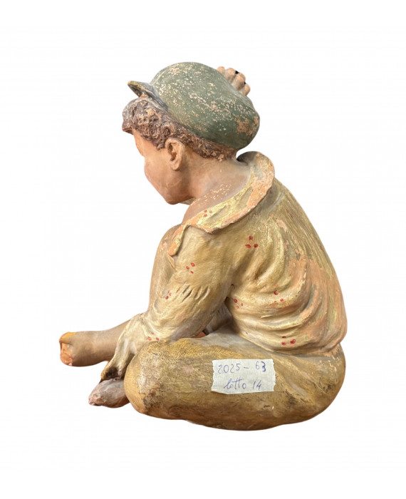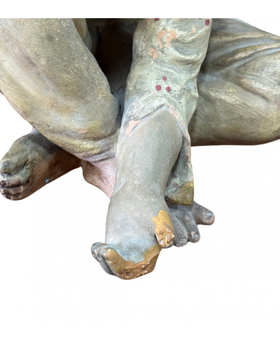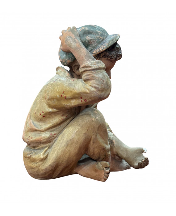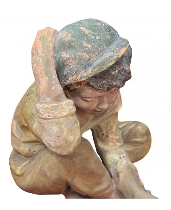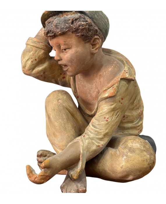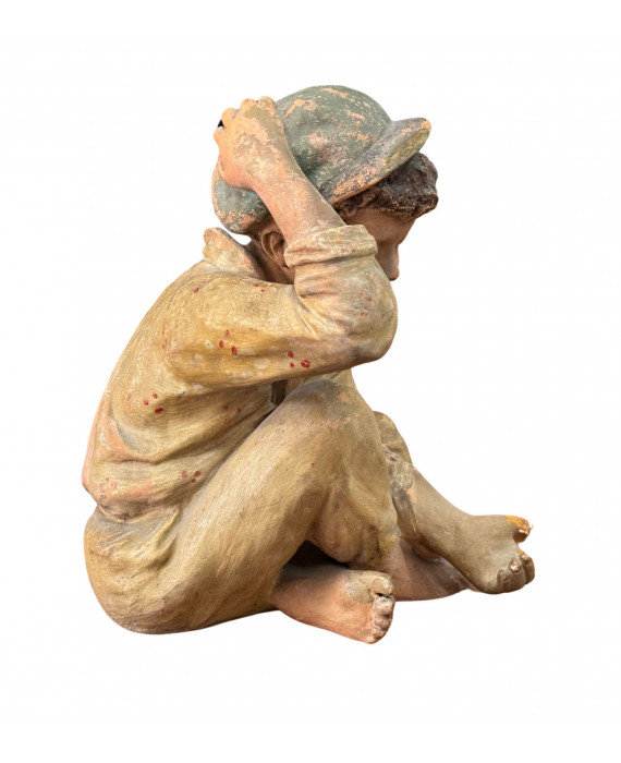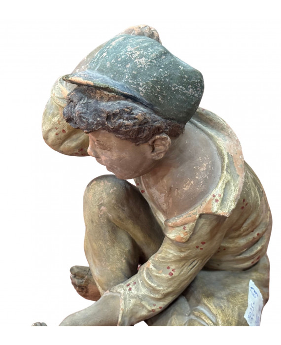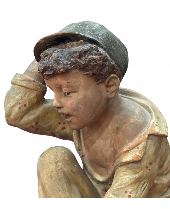 Antique Neapolitan patinated plaster sculpture, depicting a Scugnizzo (street urchin), dating from the 19th/20th century. Dimensions: 27x23x20 cm. In good condition, with minor losses on the left hand.